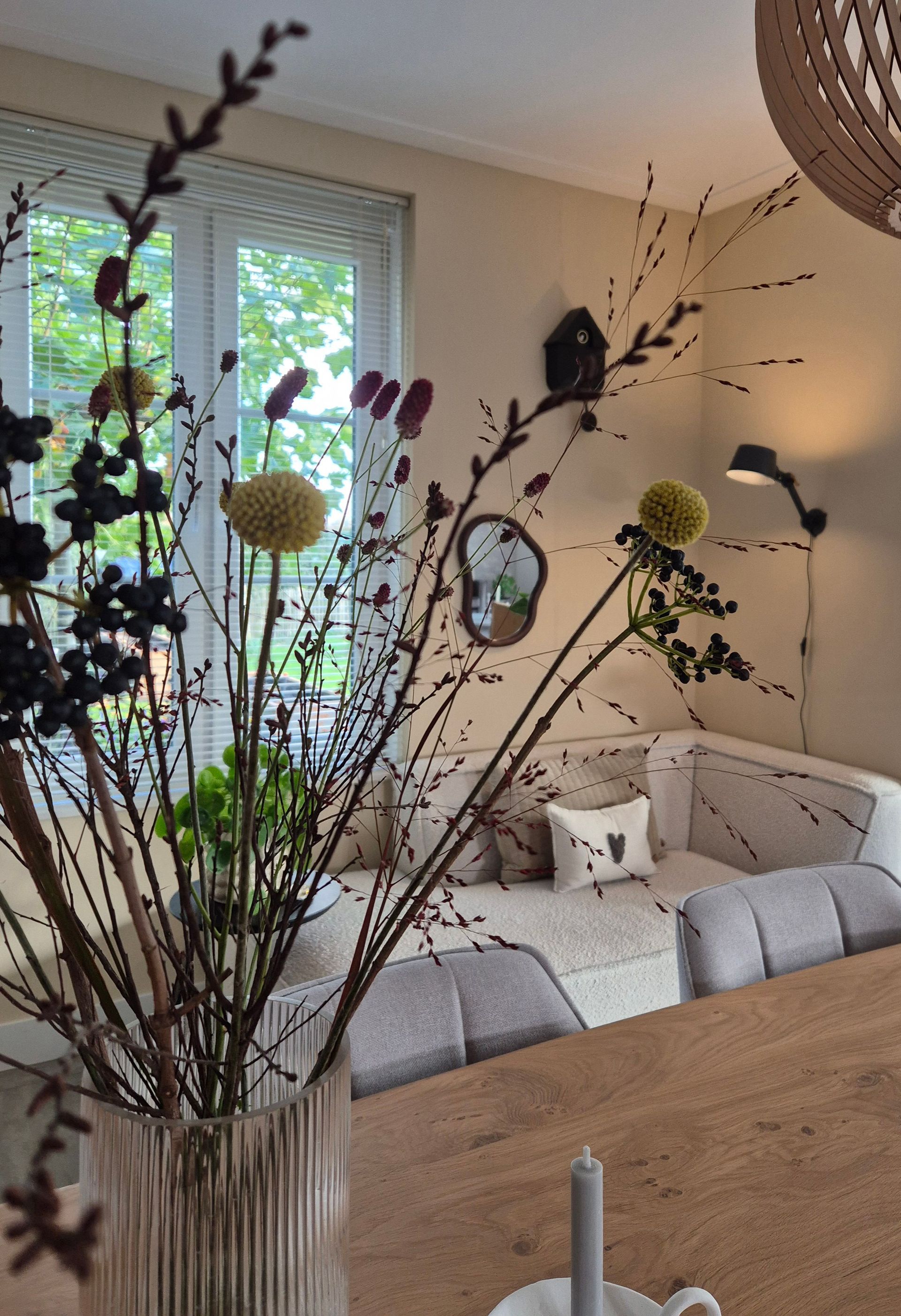 "Ik had zelf wel een idee qua kleur en stijl maar Kim heeft met haar ideeën een thuis gecreëerd. Door in 1 ruimte verschillende plekjes te creëren met hulp van vormen, kleuren, meubels (verplaatsen) waardoor de ruimte samenwerkt, warmte en sfeer ademt.